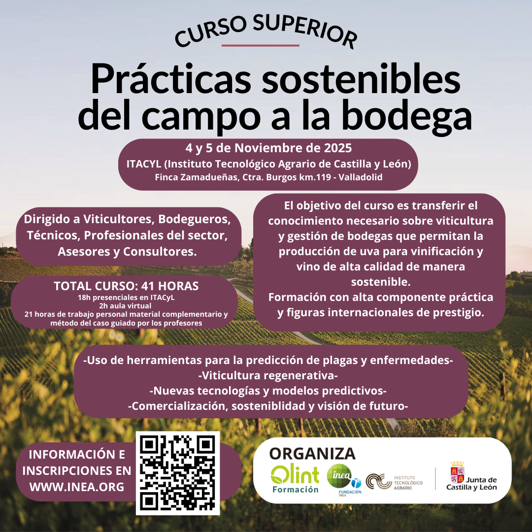 El Instituto Tecnológico Agrario de Castilla y León (ITACyL), en colaboración con la Escuela Universitaria de Ingeniería Agrícola (INEA) de la Universidad de Valladolid, Agromillora y Olint Formación, lanza la II edición del Curso Superior de Viticultura Sostenible, una iniciativa formativa pionera que busca capacitar a profesionales del sector vitivinícola para afrontar los retos actuales y futuros desde una perspectiva sostenible.